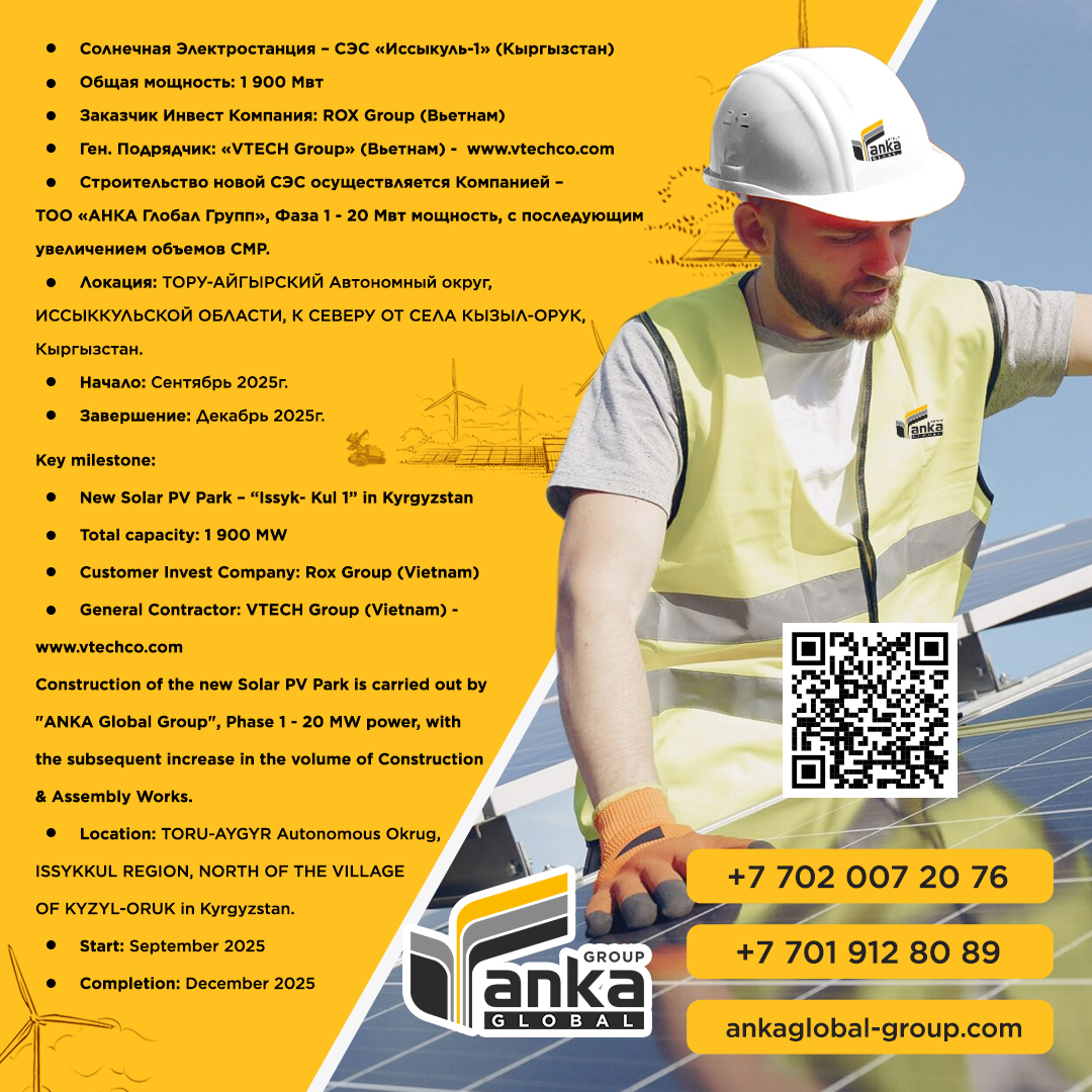 Construction of the new Solar PV Park is carried out by "ANKA Global Group", Phase 1 - 20 MW capacity, with the subsequent increase in the volume of Construction & Assembly Works up to 150 MW in Kyrgyzstan.